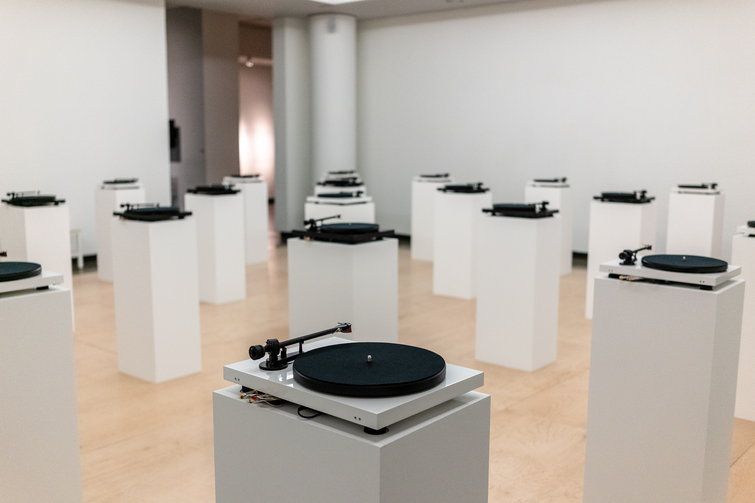 While many do believe that the firing and the opening were unrelated, artist lauren woods is convinced that they were entirely related. Further, woods does not consider American MONUMENT to be an object that can be simply dropped in a space. Woods sees American MONUMENT as a 2-year collaborative work between her and Kimberli Meyer. Therefore Woods chose neither to let American MONUMENT proceed as planned nor to pull it completely. Instead, she offered a “pause.” In this “pause” the turntables, audio system, aluminum cases, and other display cases are installed in the space and may be viewed. But the recordings, documents, and other exhibition materials have all been pulled from the space. So, a ghost of the exhibition is present, but the exhibition itself is not.